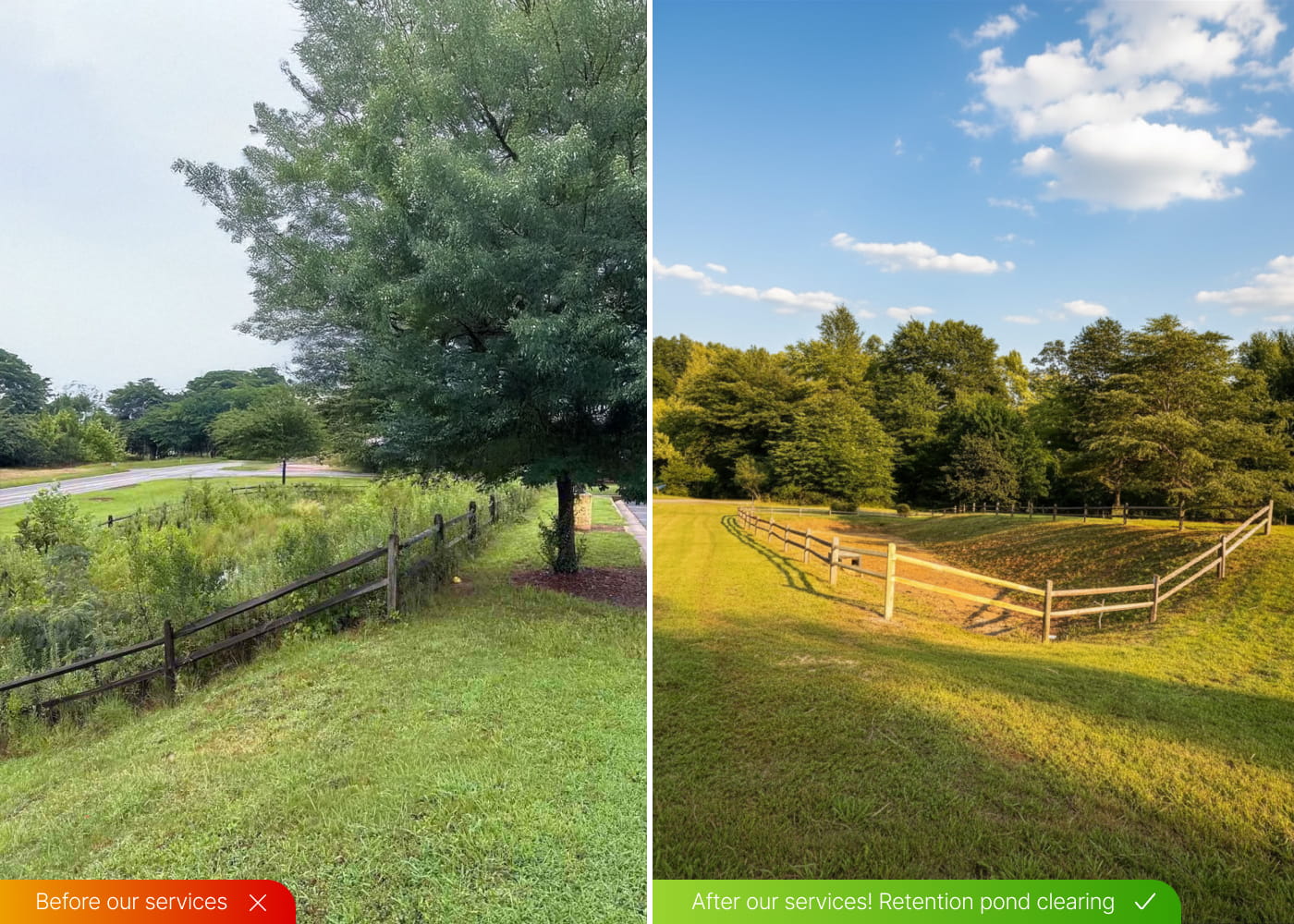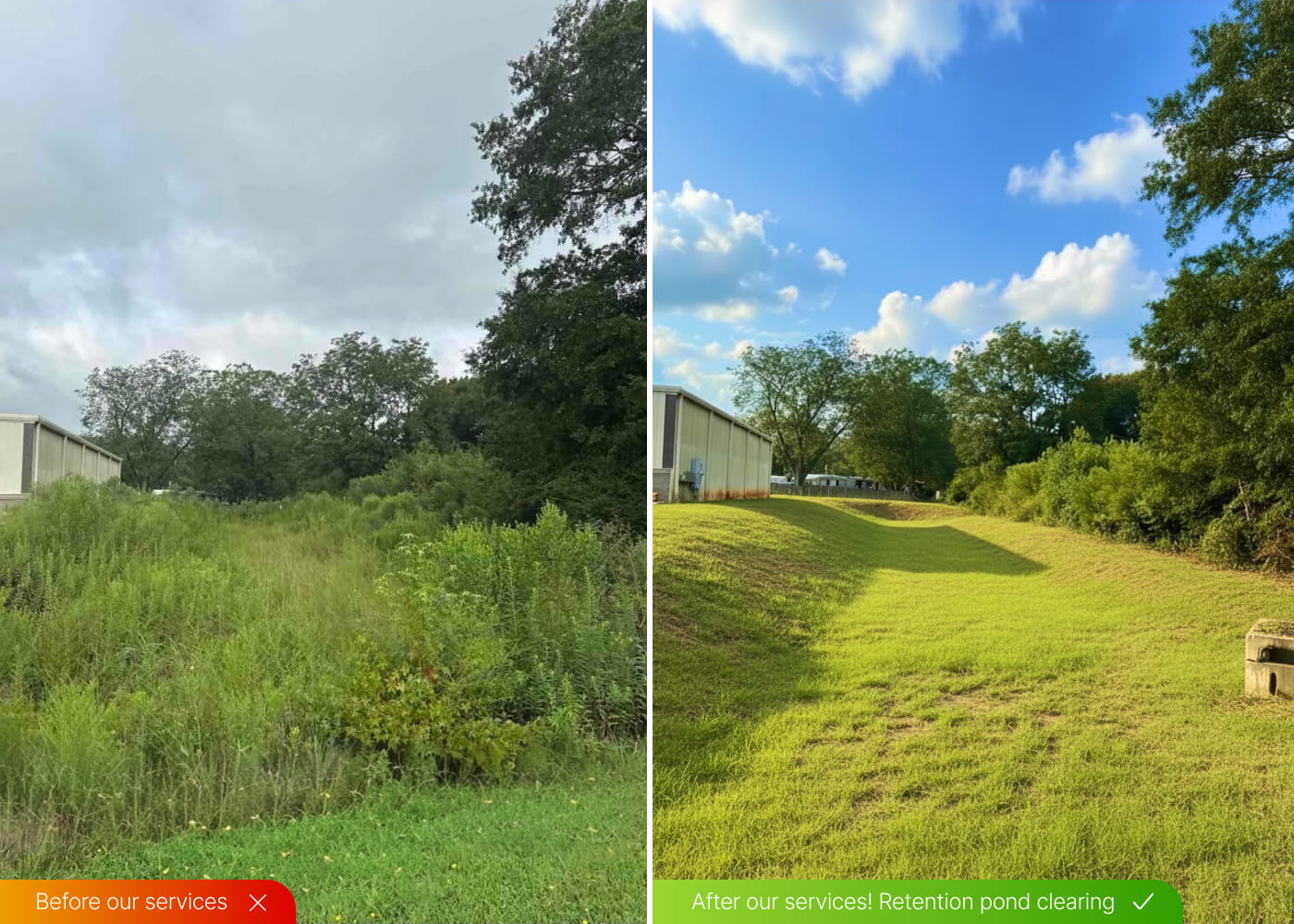 Clearing and maintenance of retention ponds to remove overgrowth, helping maintain proper drainage and safety.