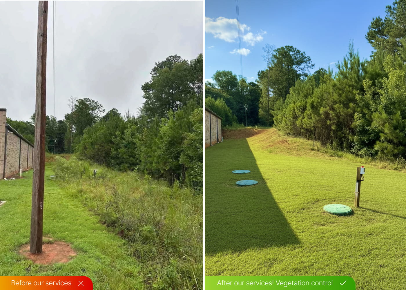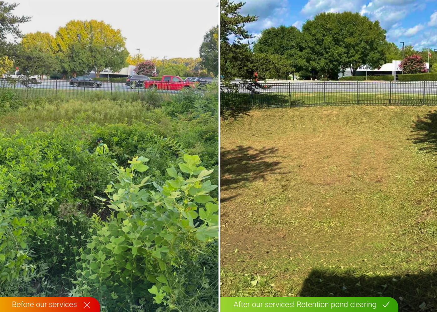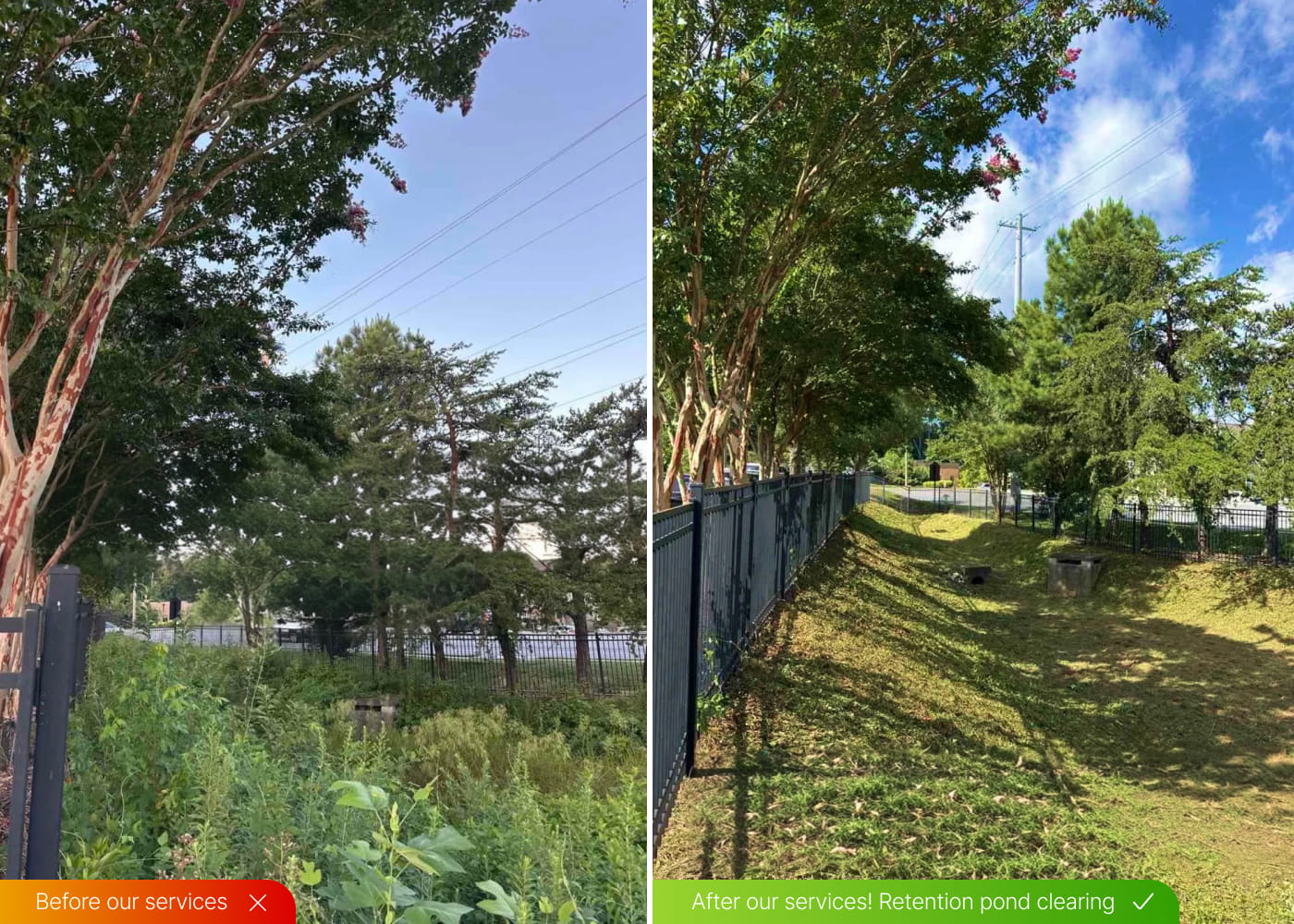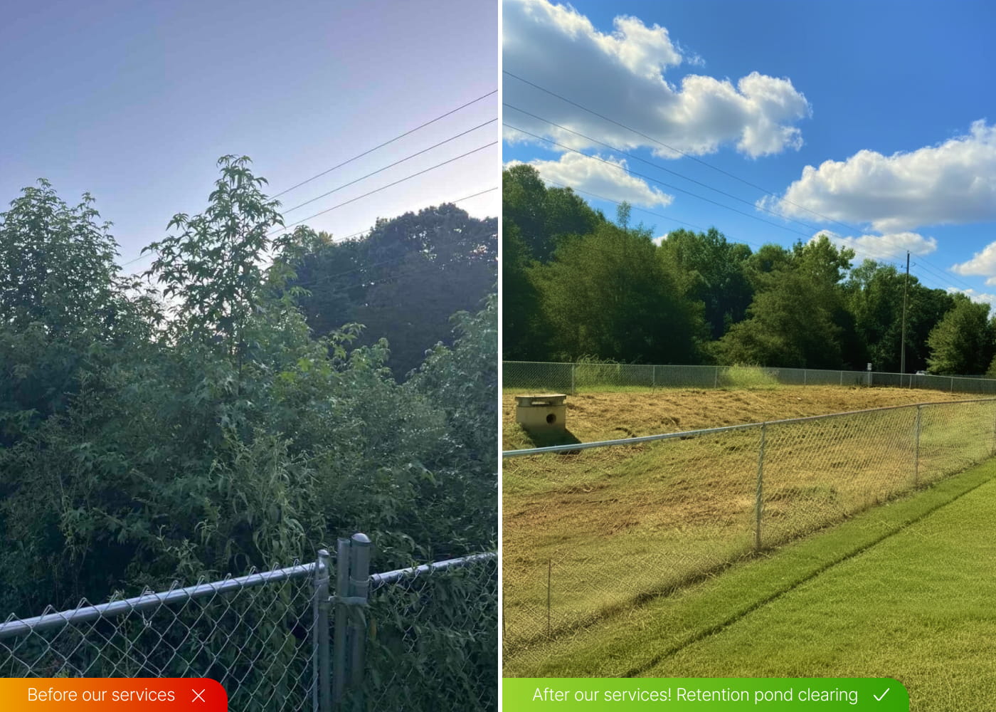 Clearing and maintenance of retention ponds to remove overgrowth, helping maintain proper drainage and safety.